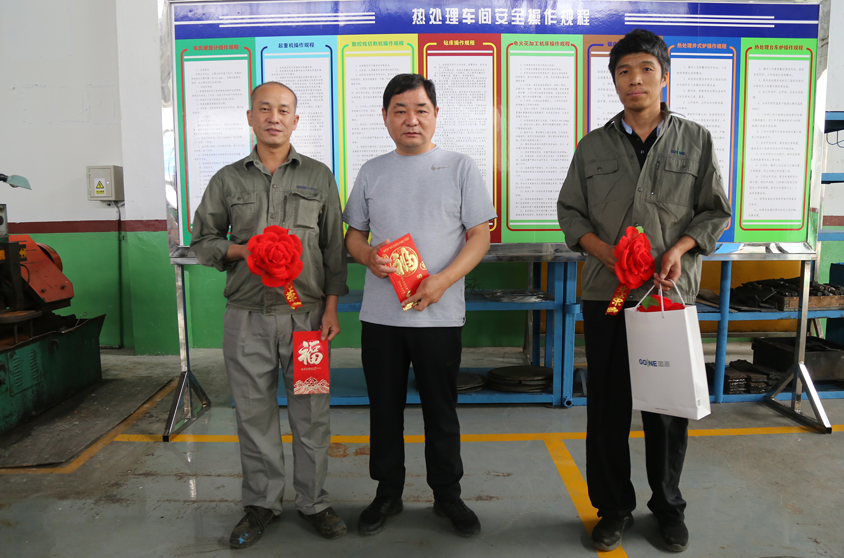 董事長劉運智先生為熱處理車間榮獲首創生產現場“標桿車間”稱號、機加車間北區榮獲首創生產現場“達標區域”榮譽稱號,頒發了榮譽牌匾;生產運營中心副總經理趙紹璞同志陪同董事長為現場標桿員工發放獎金、并佩戴光榮花。