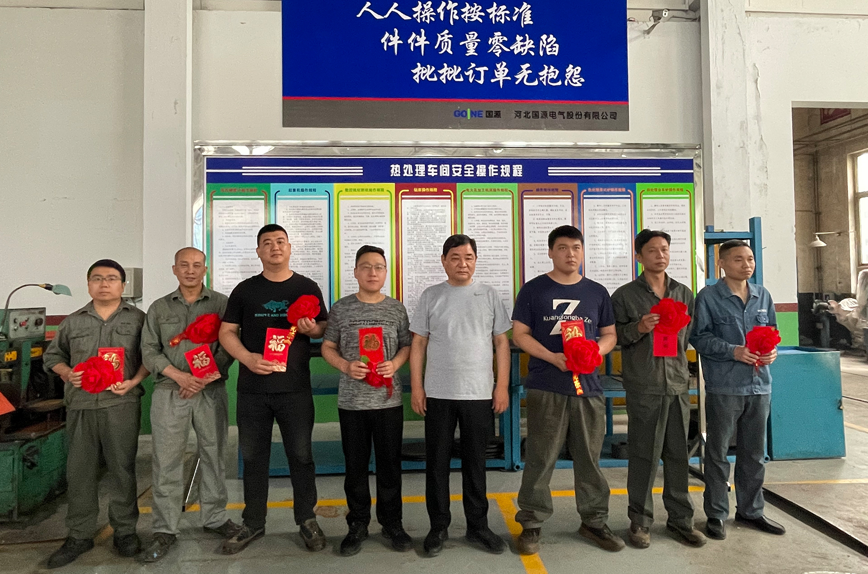 董事長劉運智先生與生產標桿現場第一戰役“4人小組”在“國源文化一條街”合影。劉董要求全公司各級管理干部和全體員工,要向受到表彰獎勵的各類現場標兵和標桿車間學習。更希望受到表彰獎勵的各類標兵和標桿車間要珍惜公司給予的榮譽、給予的認可、給予的尊重、給予的獎勵,要戒驕戒躁、再接再厲、再創高標準、高精益、高質量、高精度、高看點的品牌現場,為奪取六月份標桿現場榮譽的多連冠、標兵的多連冠、獎金的多連冠而加油、加力、加快拼搏實干吧!